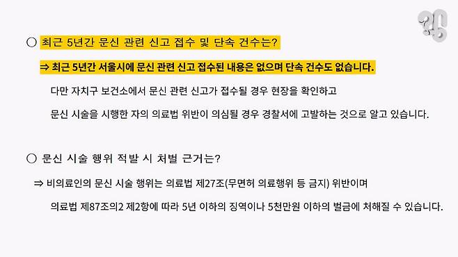 그래서 이번엔 서울시에 물어봤다. 최근 5년간 불법 문신 시술 신고나 단속 건수를 요청했는데, 복지부와 마찬가지로 ‘서울시에 접수된 문신 신고는 없고, 단속 건수도 없다’는 서면 답변이 왔다.