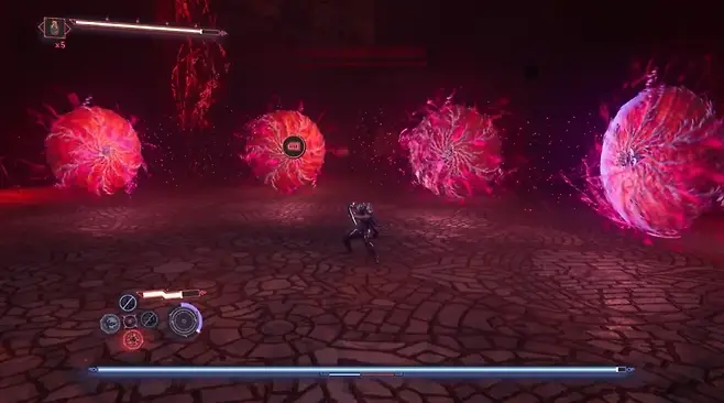 야쿠모만의 특별한 능력은 자세를 바꾸는 LT 버튼에서 비롯됩니다. 이를 꾹 누르고 있으면 적을 공격할 때 획득하는 '혈설 게이지'를 소비하는 '마귀 자세'로 바뀌며, 자신의 피와 적의 피를 무기로 거대한 핏빛 검을 만들어냅니다. 마귀 자세에서는 공격 버튼을 계속 누르고 있는 것으로 칼의 길이를 더욱 늘릴 수 있고, 다수의 적을 상대로 매우 효과적인 공격을 할 수 있게 되죠.