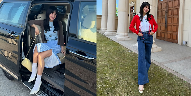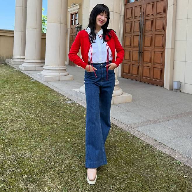 또 다른 사진에서는 화이트 셔츠와 데님 팬츠 위에 강렬한 레드 카디건으로 포인트를 주며 나이를 잊은 과감한 스타일링을 선보였다.