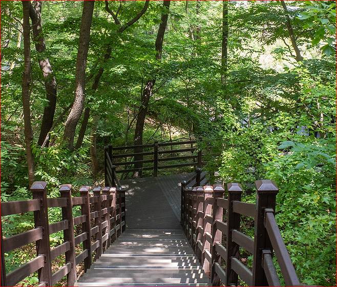 경사가 살짝 있는 구간이지만, 올라갈수록 맑은 공기와 앞산이 내려다보이는 풍경이 걸음을 가볍게 만들어줍니다.가벼운 등산으로도 충분히 도전 가능한 코스라 도심 속에서 짧은 트레킹을 즐기고픈 분들께 인기입니다.
