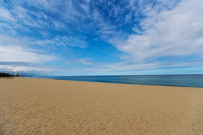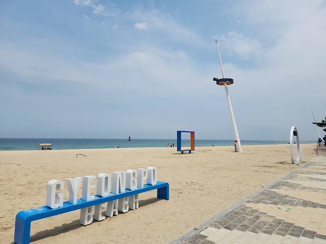 경포 해변은 언제나 그렇듯 여름철 최고의 해수욕장 중 하나로 꼽힙니다. 아이보리빛을 띠는 노란 모래 위, 우뚝 선 스카이베이 호텔이 경포 해변의 경치와 너무나 잘 어울리죠. 무더운 여름철이 되면 경포 해변은 수많은 파라솔과 붐비는 관광객들로 시끌벅적해지곤 합니다.