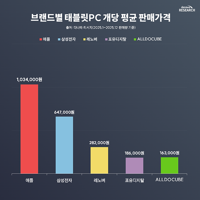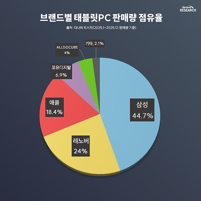 2025년 태블릿 PC 시장은 브랜드별 가격 정책과 판매 전략에 따라 점유율과 수익 구조에서 확연한 차이를 보였다. 다나와 리서치의 연간 데이터 분석 결과, 삼성전자와 레노버가 압도적인 물량으로 시장 과점 체제를 형성한 가운데 애플은 고단가 정책을 통해 프리미엄 입지를 굳건히 한 것으로 나타났다.