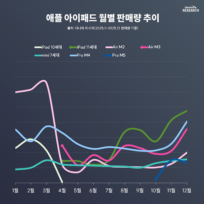 ◆ 틈새 시장과 라인업의 변화 소형 모델을 선호하는 소비자들의 선택을 받은 아이패드 미니 7세대는 연중 큰 기복 없이 완만한 판매 추이를 유지하다가, 연말 신제품 효과와 맞물려 12월에 다시 반등하는 모습을 보였다. 한편, 4월에 출시된 아이패드 에어 M3는 전작인 M2의 폭발적인 수요를 이어받기보다 하반기 신제품들과 수요를 분담하는 안정적인 흐름을 유지했다.