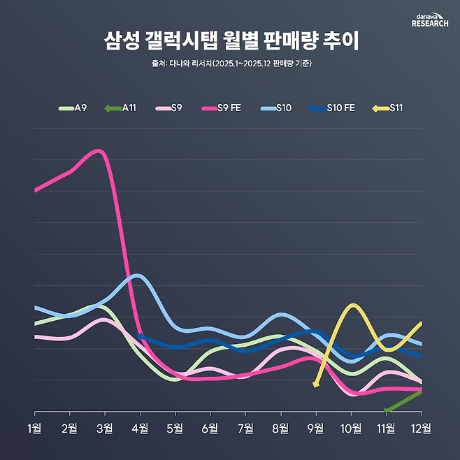 ◆ 보급형에서 프리미엄까지, 시기별 선택의 변화 소비자들은 연중 내내 보급형인 A시리즈를 꾸준히 찾으면서도, 특정 시점마다 주력 선택지를 바꿨다. 4월 이후에는 S9 FE의 대안으로 등장한 갤럭시탭 S10 FE가 새로운 중급 선택지로 자리 잡았고, 11월에는 차기 보급형인 갤럭시탭 A11이 등장하며 저가형 시장의 구매 세대교체가 이뤄졌다.