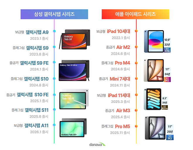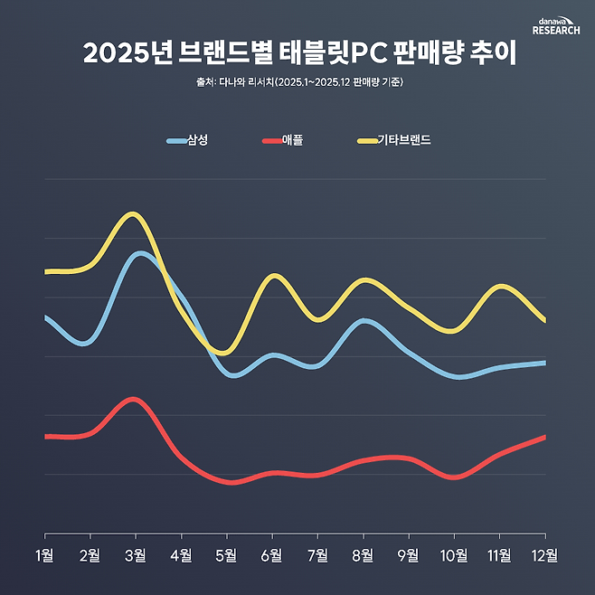 ◆ 삼성전자: 촘촘한 라인업으로 틈새 없는 공략 삼성전자는 1월에 보급형인 ‘갤럭시탭 A11’과 중급기 ‘갤럭시탭 S10 FE’를 조기 투입해 3월의 신학기 수요를 선점했으며, 판매량이 소강상태에 접어드는 8월에는 최상위 플래그십인 ‘갤럭시탭 S11’을 전격 출시해 교체 수요를 자극했다.