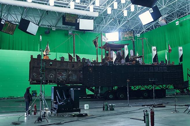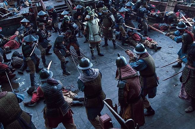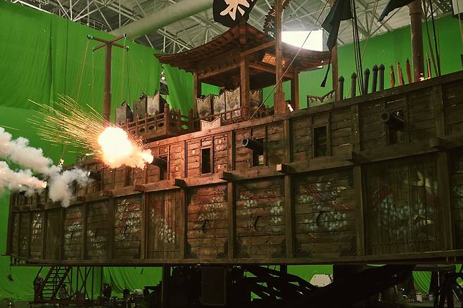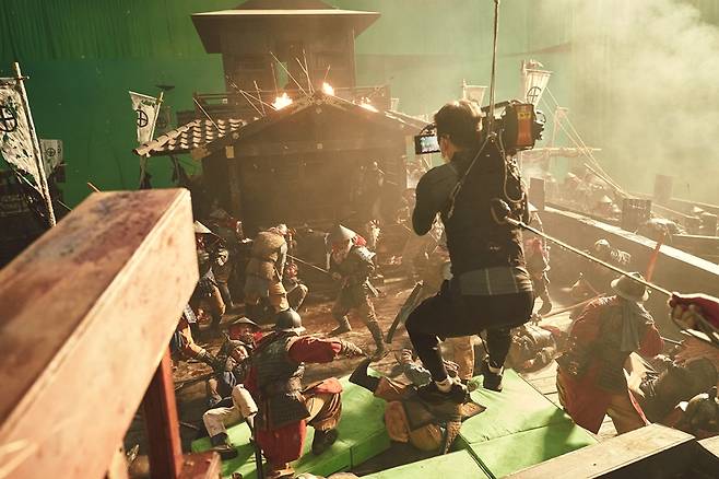 '노량'도 한산과 마찬가지로 배를 물에 띄우지 않으면서 해전 장면을 완성했다. 물 없이 리얼리티를 구현한다는 것은 쉽지 않았다. CG(컴퓨터 그래픽) 작업에만 25개 업체, 800명의 스태프가 매달렸다.