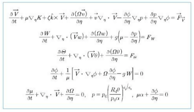 수치예보 모델은 최첨단 기술이 집약된 소프트웨어다. 핵심은 유체의 흐름을 예측하는 정교한 물리 방정식에 있다. 질량, 운동량, 열역학 변수에 대한 복잡한 비선형 방정식을 사용한다. 현대 수치예보 모델에 사용되는 방정식들은 리처드슨이나 차니가 사용했던 것보다 훨씬 복잡하고 정교하다 (그림 3).