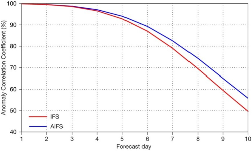 최근에는 완전히 새로운 접근법이 주목받고 있다. 인공지능(AI)을 활용한 일기예보다. 수치예보 모델처럼 복잡한 물리 방정식을 푸는 대신, AI모델은 수십 년간 축적된 방대한 날씨 데이터를 바탕으로 날씨를 학습한다. 그리고 과거 날씨 데이터에서 발견된 패턴을 활용해 날씨를 예측한다. 전통적인 수치예보 모델에 비해 훨씬 빨리 예보를 할 수 있다. 물론 슈퍼컴퓨터도 필요 없다. 그렇다고 성능이 뒤떨어지는 것도 아니다. 다수의 AI 일기예보 모델이 현존 최고의 수치예보 모델의 성능을 이미 앞지르고 있다 (그림 4, 5).