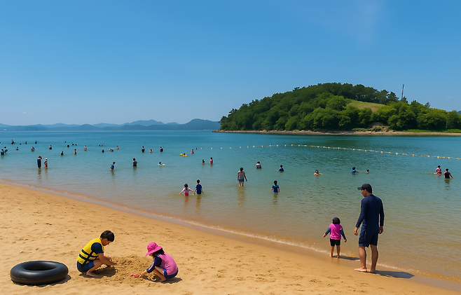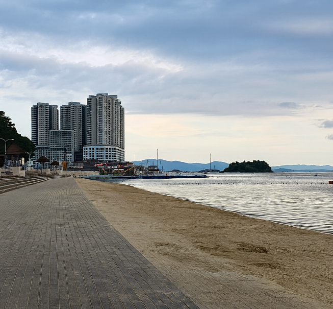 ✔️ 인공 해수욕장으로 수심이 얕고 경사가 완만해 아이부터 어른까지 안전하게 물놀이 가능