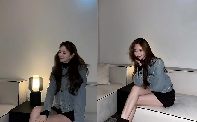 그녀가 공개한 사진 속 패션은 가을 캐주얼룩의 정석 그 자체로 완벽했다. 그녀는 빈티지한 워싱의 데님 재킷에 블랙 미니 원피스를 매치하며 시선을 모았다. 특히 소파에 앉아 환하게 웃는 모습은 35세라는 나이가 무색할 만큼 청초했다.