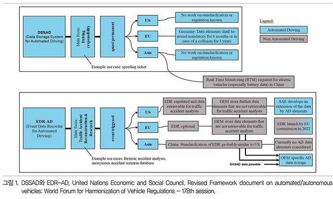 레벨3 이상의 자율주행 자동차의 판매가 시작된 지 얼마되지 않았고 아직 완전자율주행까지는 시간이 더 필요하지만, 많은 국가에서 선제적으로 법규 및 표준 논의에 참여하고 있다. 먼저 UNECE의 자율주행 전문가 그룹인 GRVA(Working Party on Automated/Autonomous and Connected Vehicles)내의 WP29에서 자율주행 기록장치에 관한 표준화 논의를 시작했다. 주요 논의 항목은 EDR과 어떻게 차별성을 가질 것인지, 사고에 대한 정의를 어떻게 명확히 할 것이며 수집 데이터 항목과 메모리 용량, 데이터 저장 전원 확보 등은 어떻게 할 것인지에 관한 것이다. 또한 DSSAD에 관한 성능 기준과 평가 방법론 개발 그리고 사이버 보안, 소프트웨어 업데이