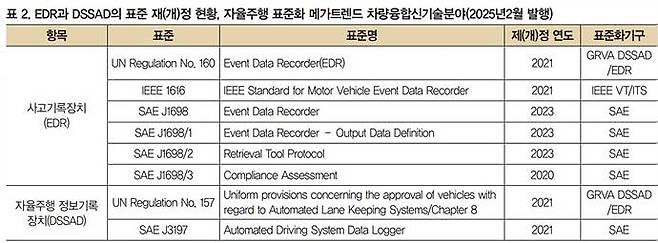앞서 살펴본 바와 같이 우리나라 차량 사고기록장치에 관한 기술과 법규는 자율주행기술의 발전과 함께 최근 들어 급격한 변화가 이루어지고 있다. 특히 2025년 12월 4일부터 시행되는 「자동차관리법」 개정안에서 자동차 제작·판매자 등은 EDR 데이터 추출 장비를 시중에 유통·판매해야 하고, 차량 소유자가 요청하는 경우 EDR 데이터와 분석 결과 보고서를 제공해야 하는 등의 제도 변화가 예정되어 있다. 이는 차량 소유자와 사고 당사자의 사고기록장치에 대한 데이터의 정합성 검증과 정보공개 요구에 대응하기 위한 법개정으로 판단되며, 자율주행기술의 발전과 함께 EDR과 DSSAD의 기술 고도화와 표준화는 산업계뿐만 아니라 국민 일상생활에도 매우 큰 영향을 미친다고 할 것이다.