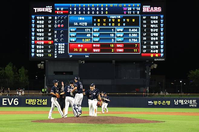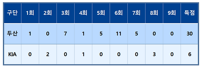 두산은 7회초 4점을 추가한 뒤 계속된 1사 2·3루에서 김기연의 1타점 유격수 땅볼로 이날 30번째 득점을 올리면서 30-6으로 승리했다.