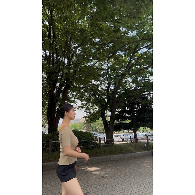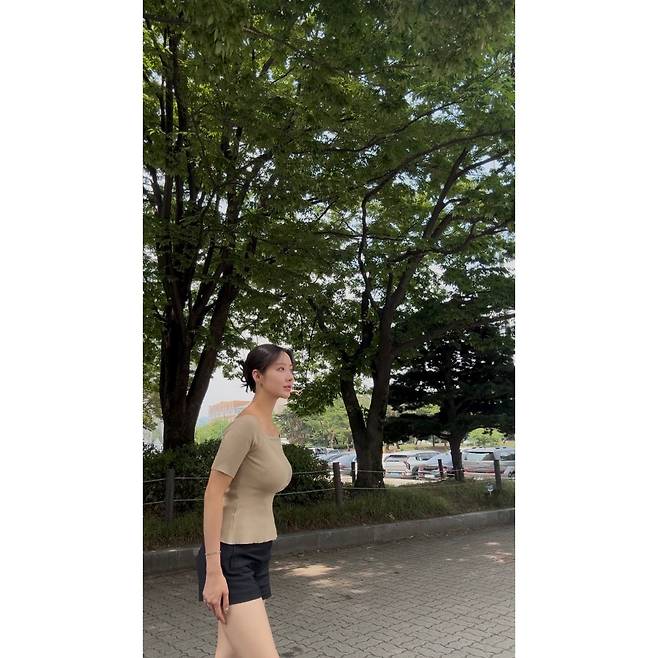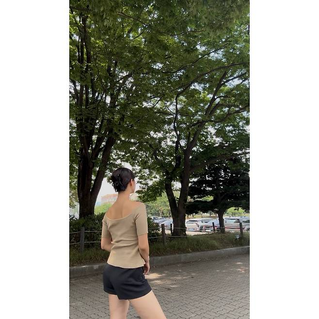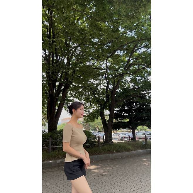 베이지 톤의 니트 톱에 블랙 숏팬츠, 군더더기 없이 단정한 조합이었지만 어깨선이 살짝 드러나는 비대칭 네크라인 덕분에 시선이 머무는 포인트가 생겼어요.