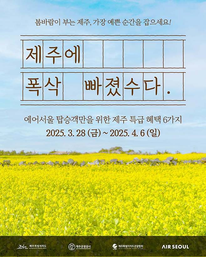 [M포스트 구기성 기자] 에어서울이 제주특별자치도, 제주관광공사와 함께 '지금 제주여행, 제주에 폭삭 빠졌수다' 프로모션을, 일본 다카마쓰 노선을 대상으로 봄맞이 프로모션을 진행한다고 밝혔다.