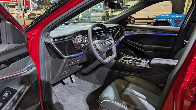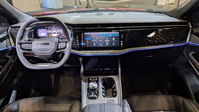 스티어링 휠은 예상보다 얇지만 손에 잘 맞는다. 차량의 포지셔닝을 강조하기 위해 지프 브랜딩 대신 왜고니어 배지를 달고 있다. 두꺼운 앰비언트 라이팅 스트립이 한쪽 도어 패널에서 대시보드를 가로질러 다른 쪽으로 이어져 있어 시각적으로 인상적이다.