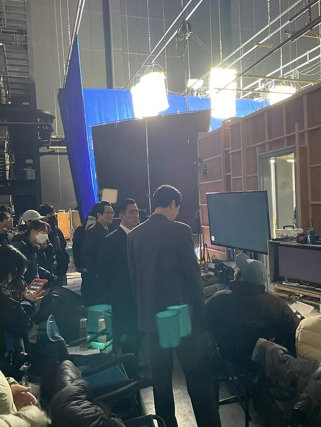 "이어 컷 사인이 날 때마다 바로 몰려와서 모니터를 확인하는 배우 류승룡, 조인성, 문성근의 뒷모습과 함께 지켜보는 박인제 감독님."