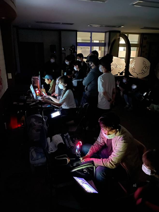 "밤샘 촬영 중인 현장. 특정 씬에서 빛이 새나가지 않도록 모든 조명을 끄고 모니터에 집중하는 감독님과 스태프들의 모습이다. 단 한 씬, 단 한 컷을 만들기 위해 백여 명이 일사불란하게 움직였다. 그 치열한 모습이, 개인 작업에 가까운 만화만 그려왔던 제 입장에선 묘한 울림과 감동으로 다가왔다."