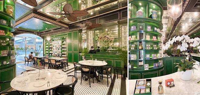 레스토랑 내부도 그린그린. 일단 럭셔리한 분위기가 압도적이다. 금색빛 거울, 화려한 샹들리에가 눈길을 끈다. 인테리어에도 페라나칸 요소들이 결합된 것이라고 한다. 특히 하이난식 치킨 라이스, 생선 카레 같은 요리를 즐기면서 매력적인 향신료의 맛을 알아가보자.