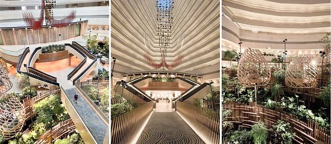 무려 높이가 40미터에 이른다. 마치 아지랑이가 일듯 투명한 유리 돔 천장 안으로 들어오는 햇빛마저 예술작품으로 승화시키는 곳. 어느 곳에서나 찍어도 인생샷이다. 물줄기가 대차게 흘러내리는 만큼 1층 폭포 바로 앞은 물이 살짝 튈 수 있다. 사진은 조금 거리를 두고 찍을 것을 추천한다.