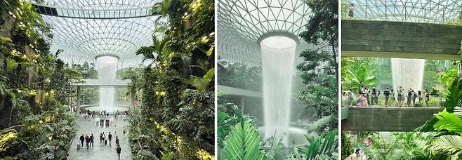 쥬얼 창이에 가면 꼭 들러야 할 인증샷 명소가 있다. 중심에 있는 세계 최대 실내 폭포인 '레인 보텍스(HSBC Rain Vortex)'다. 긴 시간 비행하고 도착했다면 보기만 해도 여독이 풀어질만하다. 이곳엔 인생샷을 찍겠다고 자리 다툼이 치열하다.