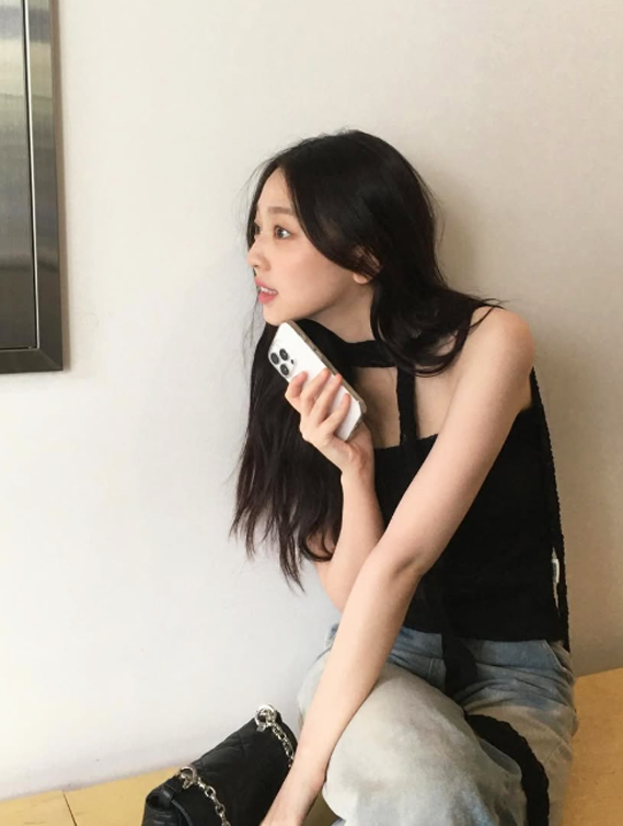 블랙 체인 백과 함께 연출된 전체적인 코디는 단순함 속에서도 트렌디함을 잃지 않았다.