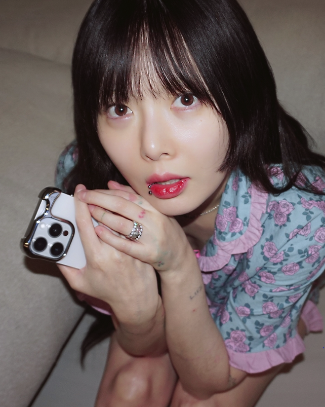 백옥 같은 피부에 자연스러운 민낯, 그리고 입술 피어싱까지 더해져, 현아만의 개성 넘치는 홈웨어 스타일이 완성됐다.