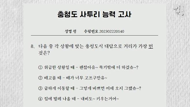 "이렇게 친구랑 가는데 친구를 만났어요. 그러면은 친구가 되게 반가워요. 그러면 ‘날 좋~다’ 그러죠. 싫은 사람이 왔을 때 ‘날 좋다’라고 하는 거는 너에게는 관심이 없다. 난 날씨에(만) 관심이 있다. 이런 뜻이고요. 말만 가지고는 충청도 사람의 말은 드러나지 않고 주변의 상황이 70% 표현이 30%라고 생각하시면 돼요"