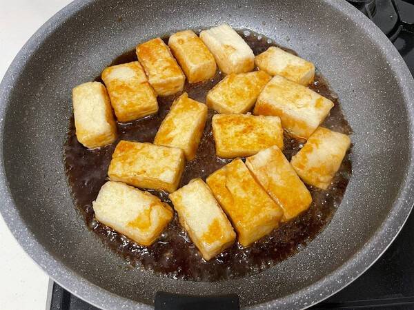 전분을 묻힌 두부는 기름을 두른 후라이팬에 노릇노릇하게 굽듯이 익혀주는 것이 가장 이상적이다. 튀기듯 익히되, 센 불보다는 중불에서 천천히 익혀야 전분이 타지 않고 겉은 바삭, 속은 부드럽게 완성된다. 양면이 노릇하게 익었다면 중간중간 옆면도 살짝 돌려가며 전체적으로 바삭한 식감을 잡아주는 것이 좋다.