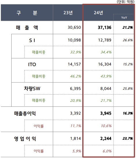 2024년 기준 사업별 매출은 ITO가 1조6304억원으로 가장 많았다. 전체 매출에서 43.9%를 차지했다. 현대차와 그룹사의 IT 운영 매출이 늘어난 영향이다. SI는 1조2789억원의 매출을 기록했다. 전체 매출의 34.4%다. 현대차의 차세대 전사적자원관리(ERP) 시스템을 구축했고 미국 조지아 메타플랜트 IT인프라 및 시스템을 구축했다.