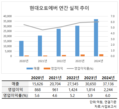 같은기간 영업이익은 868억원에서 약 159% 늘어난 2244억원으로 확대됐다. 영업이익률은 2020년 5.6%에서 2021년 4.6%로 감소했지만 이후 5.2%(2022년), 5.9%(2023년), 6%(2024년)로 상승세를 이어갔다.