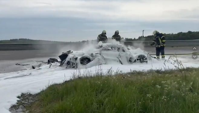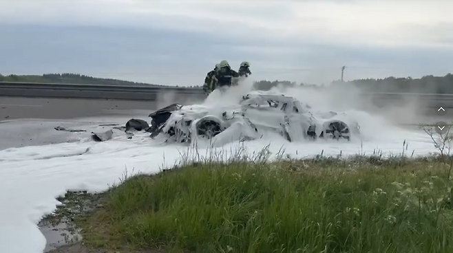 화재 진압 후 촬영된 영상에서는 화염방지제에 뒤덮인 차량 잔해가 확인됐으며, 차체는 원형을 거의 알아볼 수 없을 정도로 처참한 상태였다.