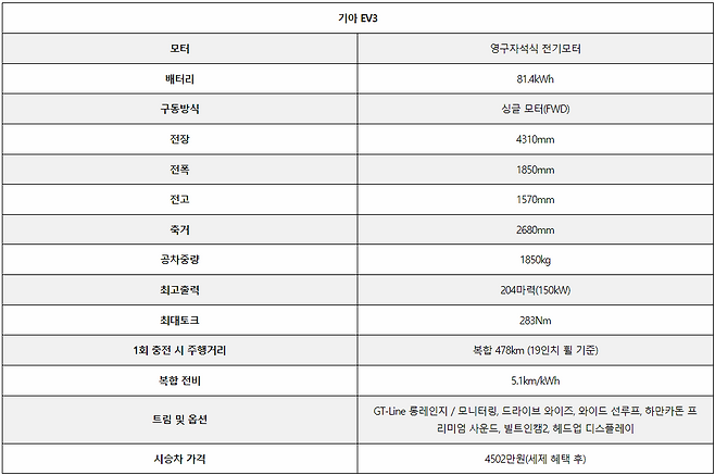 기아 EV3는 전장 4300mm, 전폭 1850mm, 전고 1560mm, 휠베이스 2680mm다. 니로 EV와 비교했을 때 실내 공간에 많은 영향을 미치는 전장과 휠베이스는 각각 120mm, 40mm 짧다. 전기차 전용 E-GMP 기반으로 전반적인 차체 길이는 짧지만 실내 공간 손해를 최소화했다.