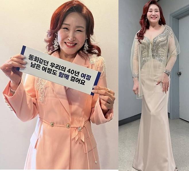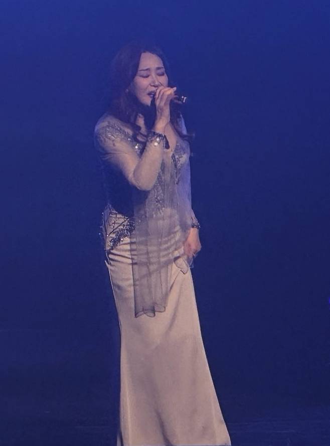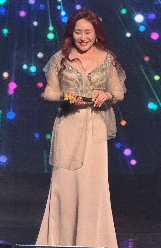 가수 주현미는 크림톤의 롱 드레스를 착용해 우아한 무드를 강조했습니다.