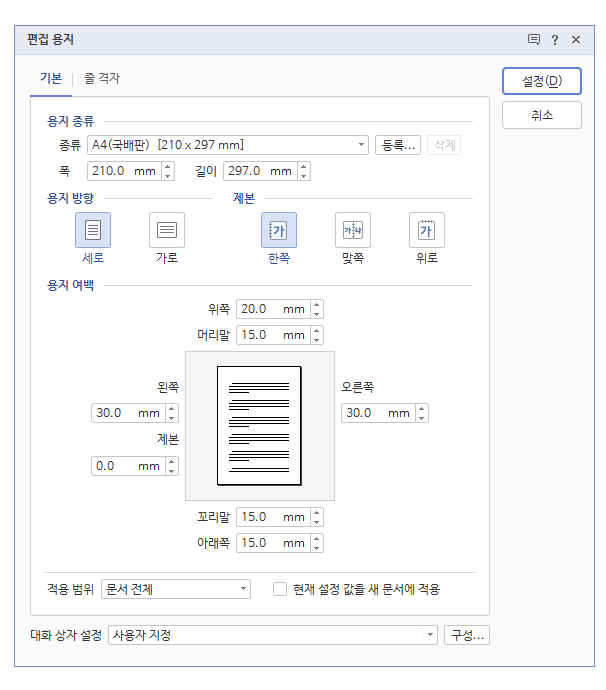 문서를 작성하기 전 반드시 확인해야 할 사항입니다. 이 부분이 자신이 원하는 방법과 다르게 설정되어 있다면 나중에 문서를 작성한 후에 수정하면 모든 것이 틀어질 수도 있습니다.
