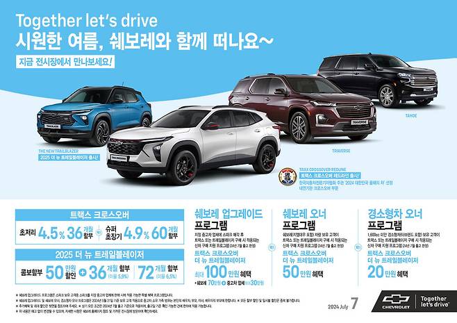 [M투데이 임헌섭 기자] 글로벌 브랜드 쉐보레(Chevrolet)가 7월 한 달간 '시원한 여름, 쉐보레와 함께 떠나요' 프로모션을 시행하며 국내 고객들에게 풍성한 혜택을 제공한다.