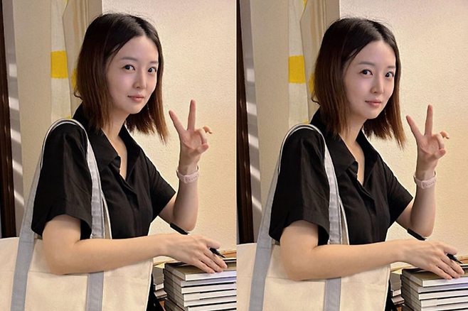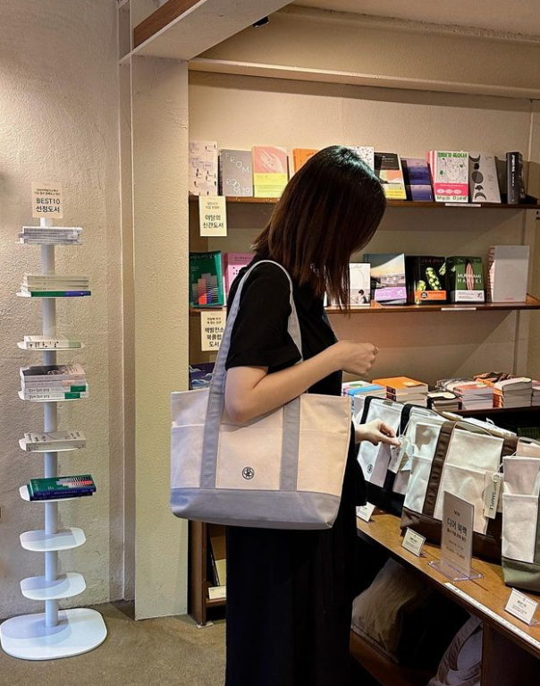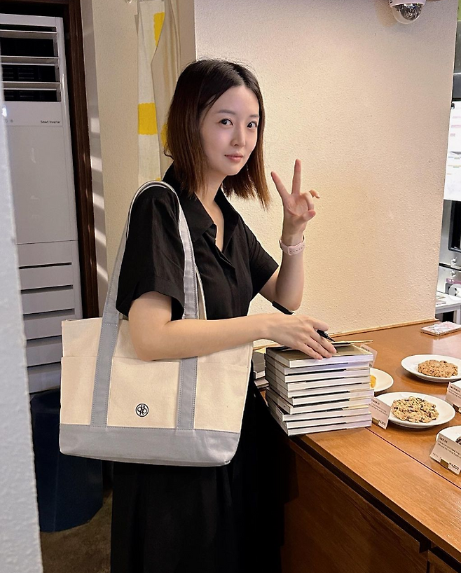 김소영은 편안하고 활동적인 블랙 원피스에 면으로 된 빅사이즈 숄더백을 매치했다.