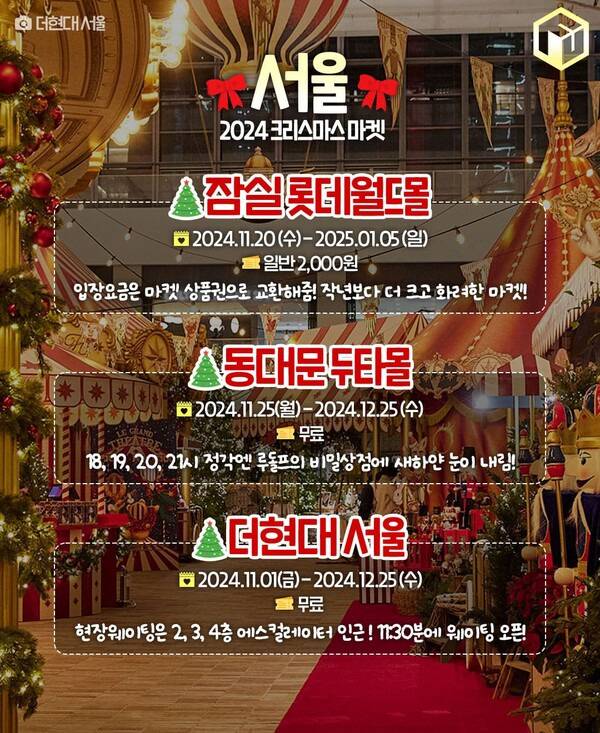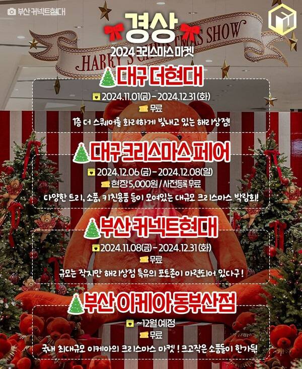 더현대 대구지점에서도 서울 더현대와 같은 컨셉의 크리스마스 빌리지가 조성됩니다. 대형 곰인형 해리와 함께하는 포토존, 다양한 크리스마스 소품과 선물을 판매하는 마켓 등이 본점 못지 않게 화려하게 연출되어 있으니 대구 지역에서 크리스마스 마켓을 경험하고픈 분들은 참고해보세요.
