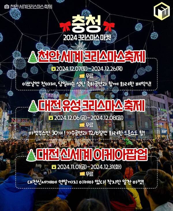올해로 9회째를 맞이하는 천안 세계크리스마스 축제가 12월 7일부터 12월 26일까지 신부문화거리에서 개최됩니다. 거리 곳곳에 크리스마스 마켓 부스가 설치되어 볼거리를 더했는데요. 12월 24일 크리스마스 이브와 12월 25일 크리스마스 당일, 오후 6시에 다양한 공연이 어우러져 신나는 연말 분위기를 완성할 예정입니다.
