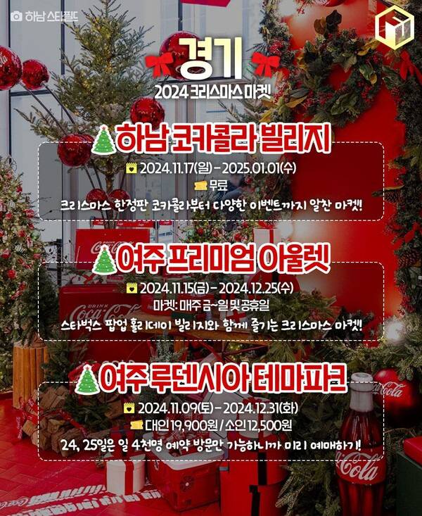 하남 스타필드에서는 많은 사람들이 사랑하는 '코카콜라'의 크리스마스 빌리지 팝업이 펼쳐집니다. 15m의 자이언트 트리와 코카콜라, 폴라베어로 가득 채워져 이국적인 분위기까지 느낄 수 있는데요. 한정판 코카콜라부터 다양한 이벤트까지 알차게 마켓을 즐길 수 있습니다.
