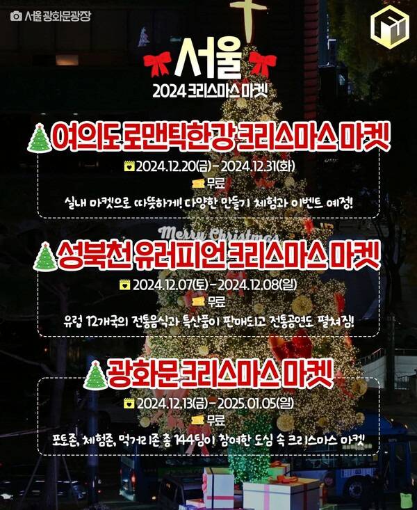 매년 겨울 서울의 중심, 광화문광장과 세종로 공원 일대는 대규모 크리스마스 마켓으로 변신합니다. 먹거리와 크리스마스 소품, 수공예품 등을 판매하는 100여 개의 상점이 마련되며 곳곳에 로맨틱한 포토존까지 설치될 예정인데요. 대형 크리스마스 트리와 미디어 파사드쇼, 청계천 일원의 빛초롱 축제까지 화려한 크리스마스 마켓을 즐길 수 있습니다.