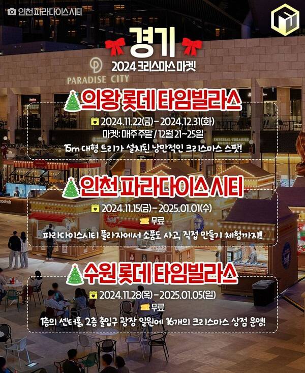 영종도의 파라다이스시티 플라자에서는 럭셔리한 크리스마스 마켓이 펼쳐집니다. 다양한 아트워크와 포토존, 고급스러운 크리스마스 마켓이 즐비해있는데요. 주말이면 특별한 이벤트가 진행되기도 합니다. 리조트 내 따뜻한 노천 스파 공간인 씨메르와 함께 연계해 다녀오기 좋은 국내 크리스마스 마켓입니다.