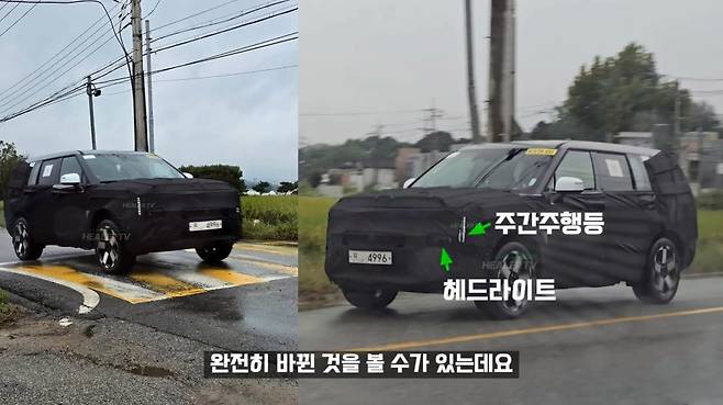 최근 유튜브 힐러TV 등에서 공개된 위장막 테스트카 영상에 따르면, 페이스리프트 싼타페는 현행 모델보다 한층 세련되고 미래지향적인 디자인이 예고되고 있습니다. 슬림한 헤드램프와 측면을 따라 이어지는 DRL(주간주행등)은 이전의 각진 인상보다 한결 부드럽고 고급스럽게 다가옵니다. 랜드로버 스타일을 벗어난 차체와 새로운 패턴의 대형 그릴, 넓이를 강조한 수평 몰딩 등도 변화의 핵심 포인트입니다.