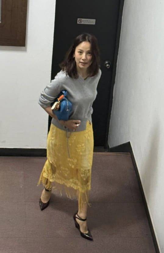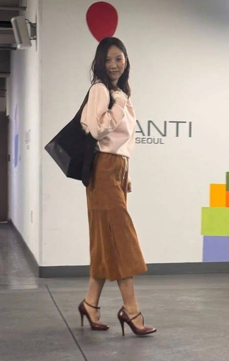 트렌드에 민감한 이효리는 최근 주목받는 ‘보호시크(보호+시크)’ 스타일도 자연스럽게 흡수했다. 부드러운 파스텔 상의에 차분한 브라운 롱스커트를 더한 조합은 보호시크의 정석이라 할 수 있으며, 여기에 버건디 컬러의 힐을 매치해 고급스러움을 더했다.