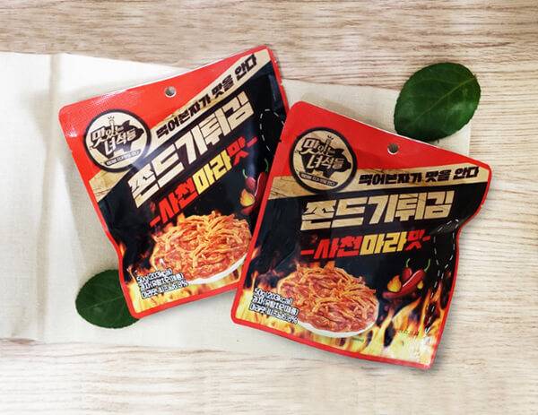 케이블TV의 예능 프로그램으로 인기인 ‘맛있는 녀석들’의 브랜드를 활용한 마라맛 간식으로 ‘쫀드기튀김 사천마라맛’이 있다. 오징어 원물을 사용해 오징어 고유의 쫄깃한 식감을 즐길 수 있는 제품이다. 마라맛 시즈닝 6.8%를 함유해 매콤하면서도 강한 중독성을 경험할 수 있다. 집에서 간단하게 즐길 수 있는 안주로, 혹은 여행이나 캠핑에서 먹기 좋은 간식으로 들 수 있다. 판매가는 개당 2천 원 내외로 형성돼 있다.
