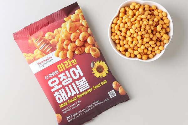 대형 마트 운영사인 홈플러스는 자사의 PB인 홈플러스시그니처로 ‘마라맛 오징어 해씨볼’을 출시했다. 튀기지 않고 구워서 바삭바삭한 식감의 미니볼 속에 고소한 해바라기씨가 들어간 제품이다. 매콤한 맛의 마라맛 시즈닝이 듬뿍 뿌려져, 얼얼하고 매콤한 풍미도 느낄 수 있다. 안주로 즐기기에도 좋은 제품으로, 넉넉하게 먹을 수 있도록 한 봉지에 202g의 과자를 담았다. 홈플러스 판매가는 봉지당 1,990원이다.