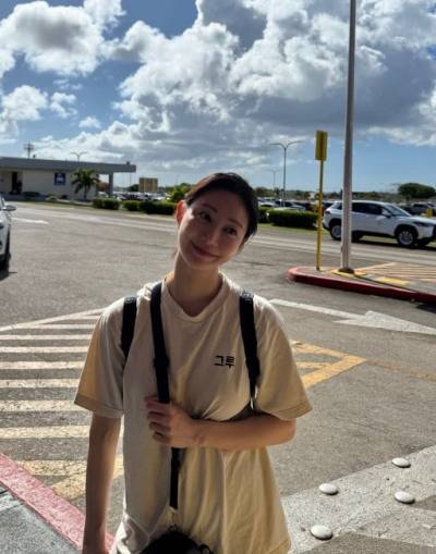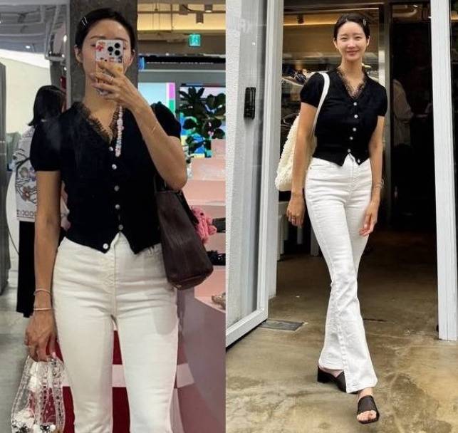 여기에 화이트 하이웨이스트 팬츠를 매치하여 전체적인 룩에 밝고 경쾌한 균형을 맞췄습니다. 슬림한 핏과 살짝 퍼지는 밑단은 다리 라인을 더욱 길어 보이게 하는 효과를 주었죠. 블랙 슬리퍼 힐과 베이식한 숄더백으로 마무리하여 실용성과 스타일을 동시에 잡았으며, 머리핀과 액세서리로 캐주얼한 포인트를 더해 세심한 스타일링 감각을 뽐냈습니다.
