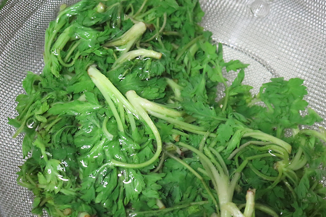 데친 쑥은 찬물에 10분 정도 담가 색을 선명하게 유지한 후 물기를 꼭 짜주세요.