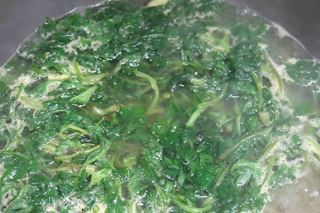 물기를 꼭 짠 데친 쑥을 냄비에 넣고, 대파와 다진 마늘, 들깨가루를 추가합니다. 국물이 한 번 더 끓어오르면 마지막으로 간을 확인한 다음 맛있게 먹습니다.