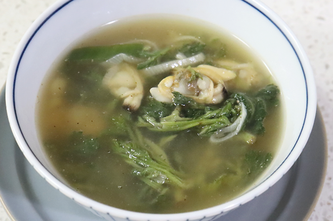 바글바글 끓고 있는 냄비에서 퍼지는 쑥 향이 봄을 한껏 느끼게 해 줍니다. 어릴 적 먹던 그 맛이 생각나죠? 바지락이 더해져 국물이 시원하고 구수하면서도 깔끔해요.
